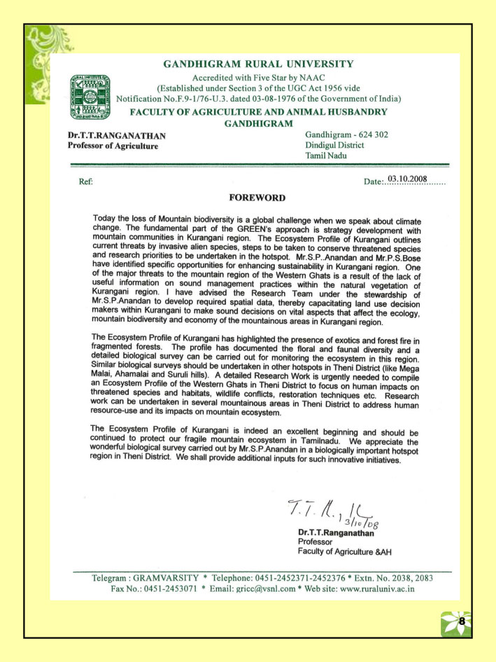 2011 Fellowship Award (National) Fellowship award received from M.S.Samynathan foundation, Chennai